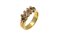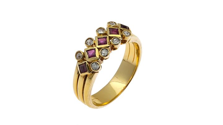 in oro giallo, sommità geometrica, con diamantini taglio brillante di vecchio taglio per totali ct 0,20 ca e rubini taglio carrè per totali ct 0,50 ca