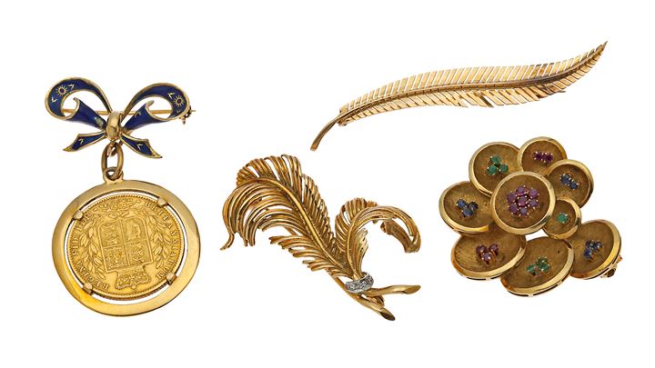 LOTTO DI 4 SPILLE Peso gr 37 -due in oro giallo e bianco a forma di piuma...