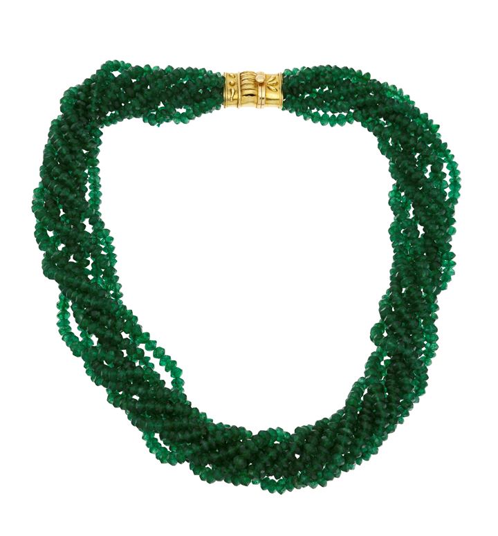 composto da otto fili di smeraldi briolette lavorati a torchon. Chiusura in oro giallo