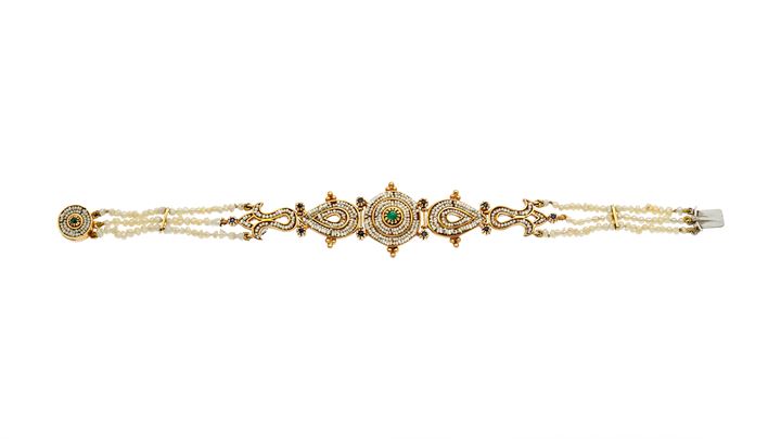 borbonico, in oro a bassa caratura ed argento, con perline, zaffiri e smeraldi taglio rotondo