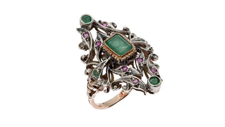 in oro giallo ed argento, in stile, con smeraldi e piccoli rubini