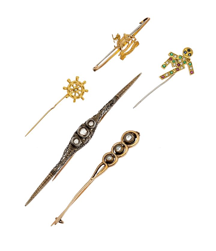 LOTTO DI CINQUE SPILLE -in oro giallo, ago in metallo, con l'immagine di un...