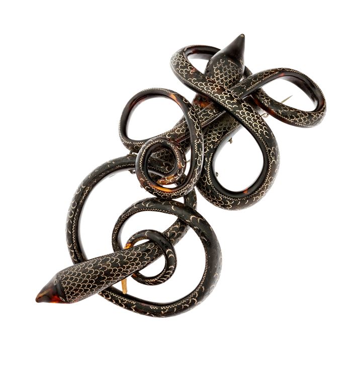 periodo vittoriano, con due serpenti intrecciati con decori in oro. Ago in metallo