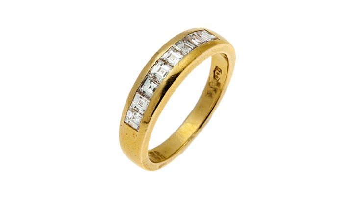 in oro giallo, sommità bombata, con otto diamanti taglio carrè per totali ct 0,70 ca