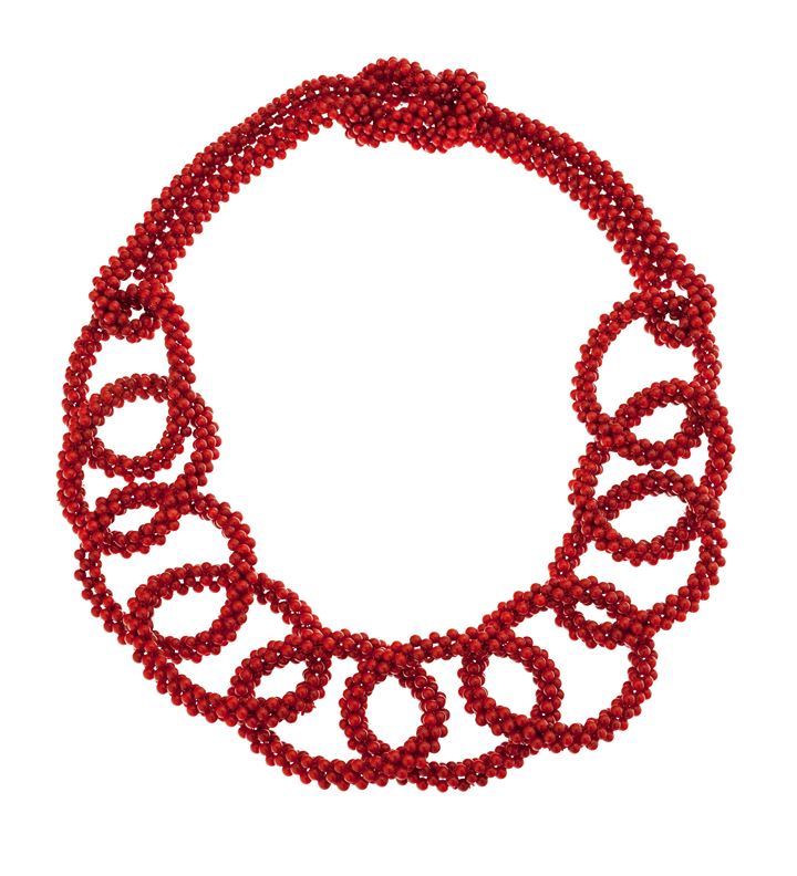 composta da anelli ovali in sfere di corallo rosso mediterraneo del diam di mm 3,0 ca, intrecciate a cordone