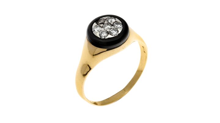 in oro giallo con sommità rotonda con pavè di diamanti taglio brillante per totali ct 0,25 (uno mancante) delimitata da un anello in onice