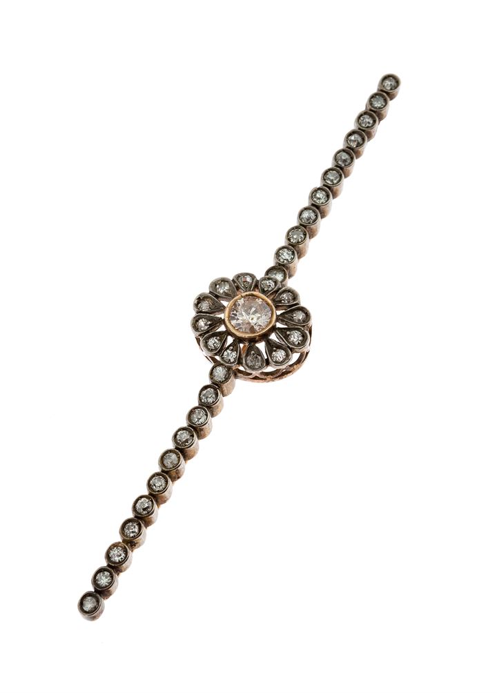 in oro a bassa caratura ed argento, a forma di barretta, con diamanti taglio brillante di vecchio taglio per totale di 1,50 ca