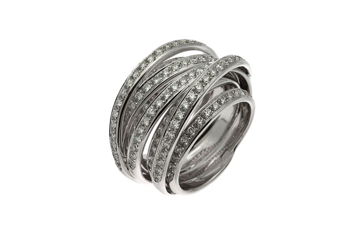 Anello in oro bianco, firmato "Mattioli", sommità composta da fili intrecciati in diamanti taglio brillante per totali ct 1,30 ca