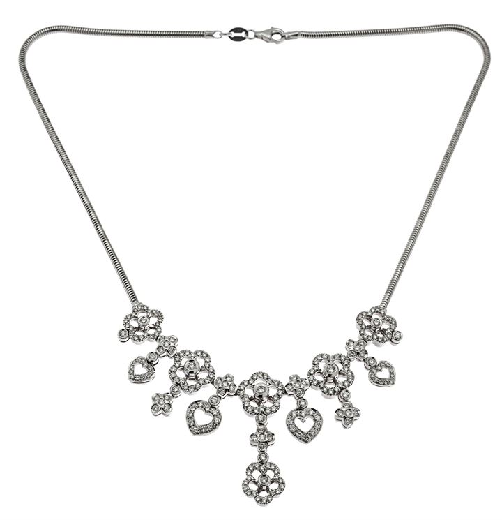 in oro bianco con catena a coda di topo e parte centrale con fiori e cuori stilizzati in diamanti taglio brillante per complessivi ct 1,80 ca