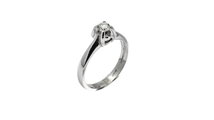 in oro bianco con diamante solitario taglio brillante di ct 0,20 ca, probabile colore G, purezza IF-VVS
