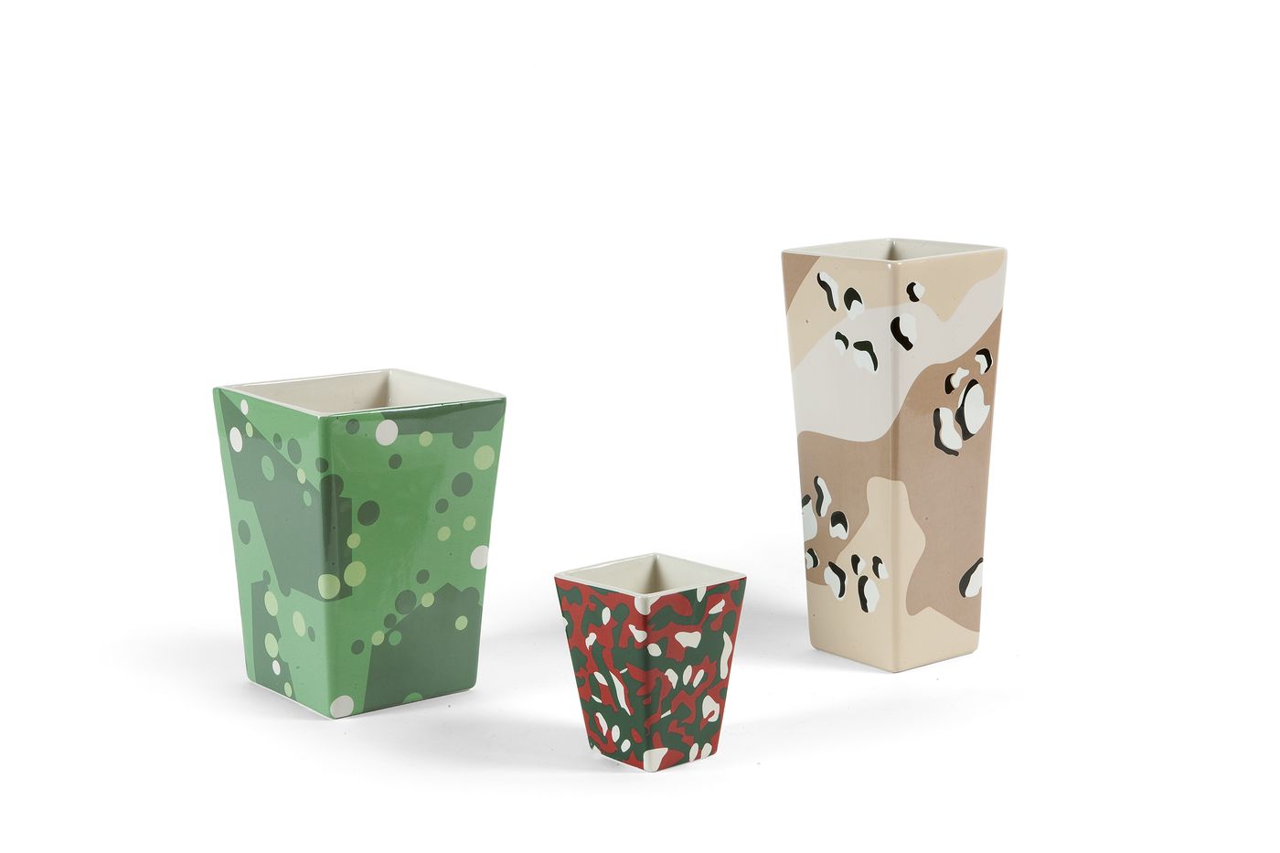 MENDINI ALESSANDRO, RASULO PROSPERO Tre vasi in ceramica Marcati alla base Zanotta Edizioni Made in Italy. Alessandro Mendini Prospero Rasulo. rispettivamente h cm 31, 22 e 13 Bibl.: Fotocopia della pagina del catalogo Zanotta Edizioni disponibile.