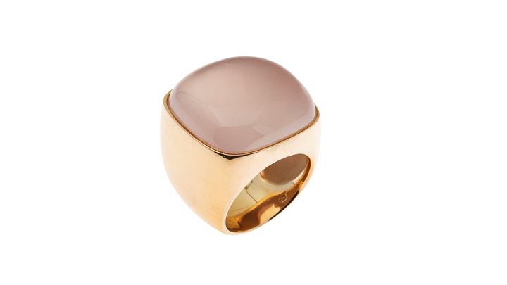 in oro rosa, sommità quadrata, con quarzo rosa cabochon