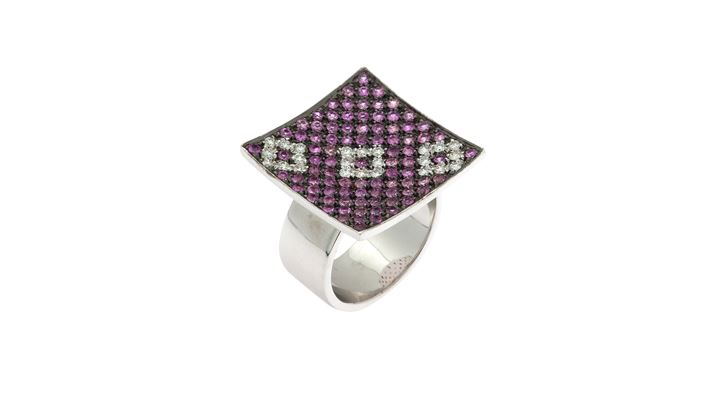 in oro bianco, sommità di forma quadrata, con pavè di zaffiri rosa taglio brillante per totali ct 2,50 ca ed inserto con diamanti taglio brillante di colore bianco per totali ct 0,40 ca