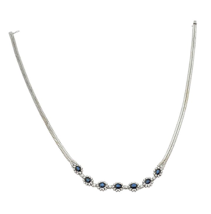 in oro bianco con al centro sette zaffiri taglio ovale per totali ct 5,0 ca e diamanti taglio brillante per complessivi ct 1,60 ca