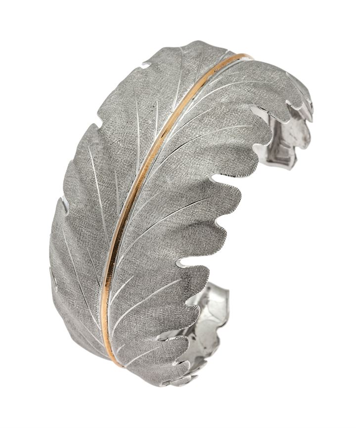 Bracciale in argento 925/1000 satinato con inserto centrale in oro rosa, firmato" M. Buccellati", a forma di foglia