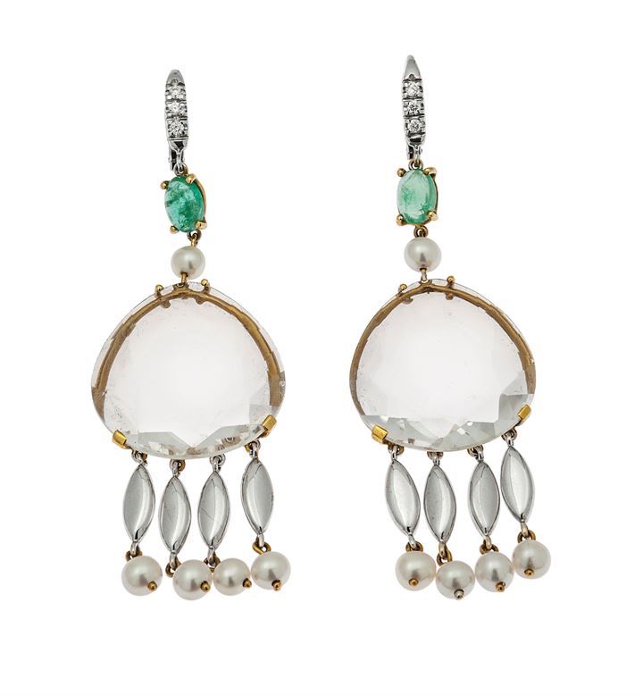 pendenti, in oro giallo, con gocce di cristallo di rocca sfaccettato, due smeraldi cabochon, frange con perline e piccoli diamanti taglio brillante