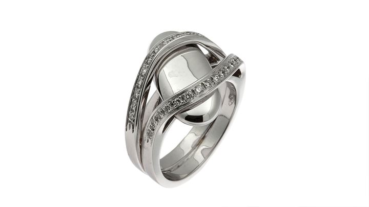 in oro bianco, sommità con due file di diamanti taglio brillante per totali ct 0,25 ca trattenenti al centro elemento ovale