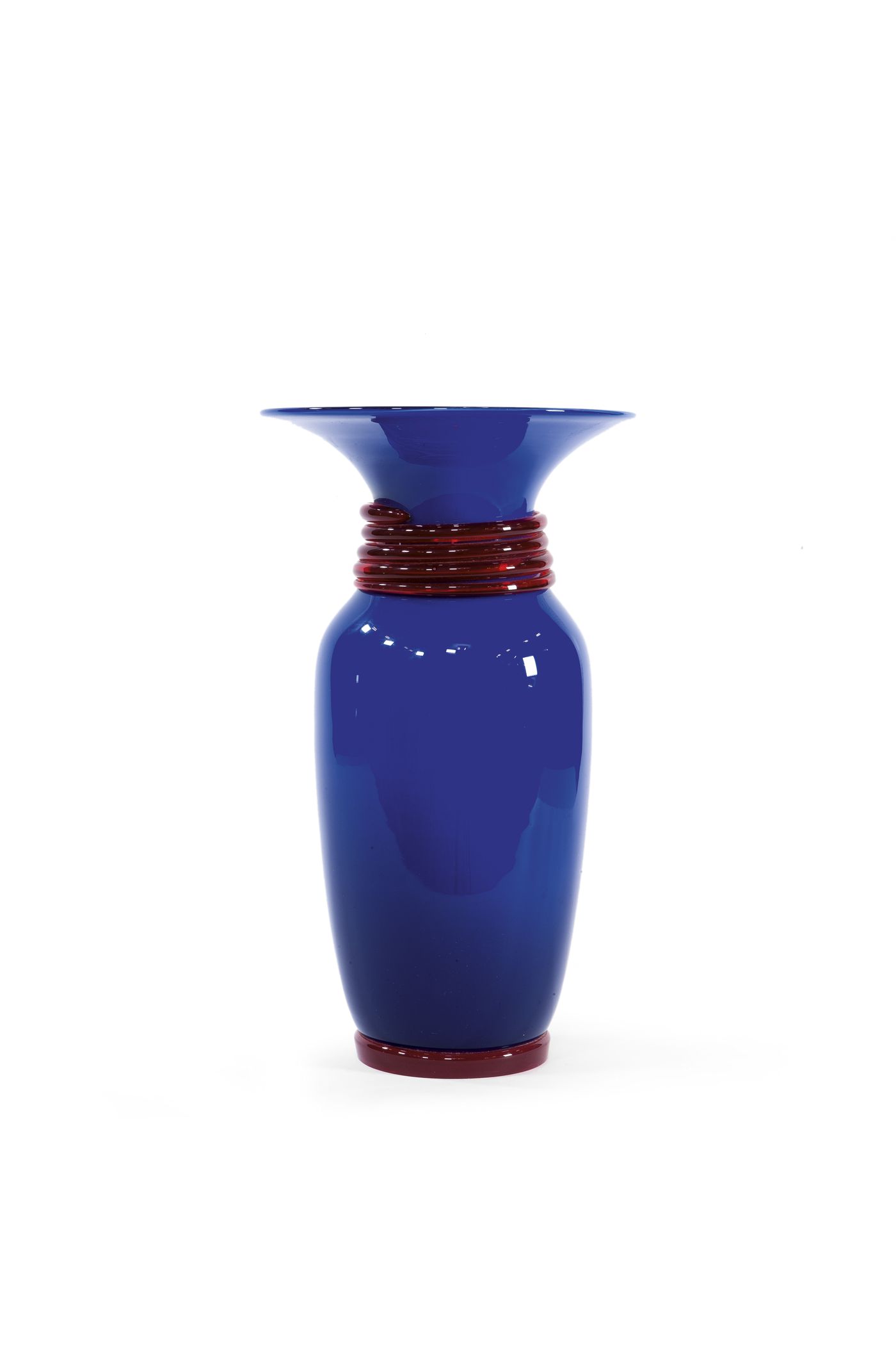 ZUCCHERI TONI Masai Vaso in vetro opalino blu con cordone rosso. Prod. Veart 1990 circa. h cm 36 Bibl.: Fotocopia catalogo Veart disponibile