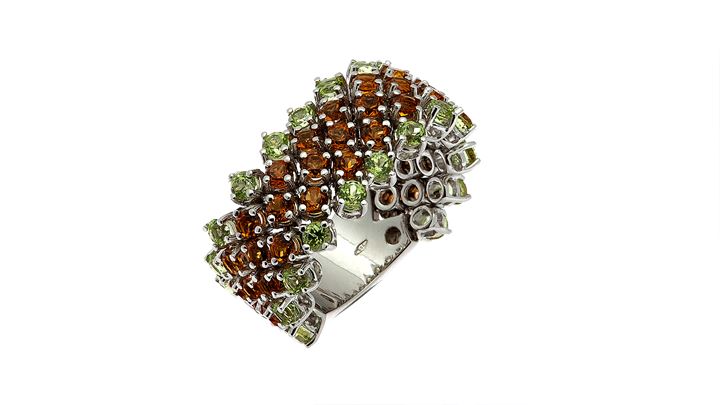 in oro bianco, a maglia morbida, con due file centrali di quarzo madera taglio brillante, inserite tra due file di peridoti taglio brillante