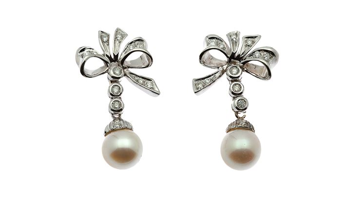 pendenti in oro bianco, fiocchi ai lobi e corpo in diamanti taglio brillante per totali ct 0,30 ca, terminanti con due perle giapponesi del diam di mm 8,5 ca