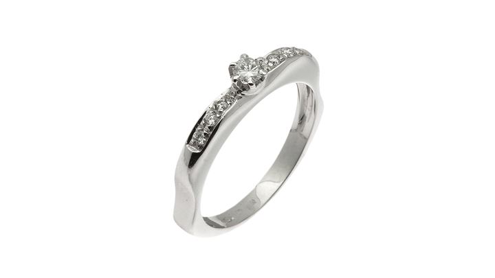 in oro bianco, di forma geometrica, con diamante taglio brillante centrale di ct 0,12 ca e laterali per complessivi ct 0, 20 ca