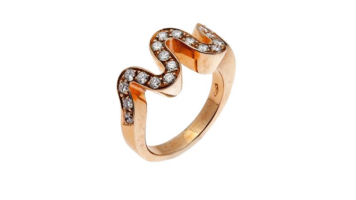 in oro rosa, sommità lavorata a onde, con diamanti taglio brillante per totali ct 0,70 ca, probabile colore G, purezza IF-VVS