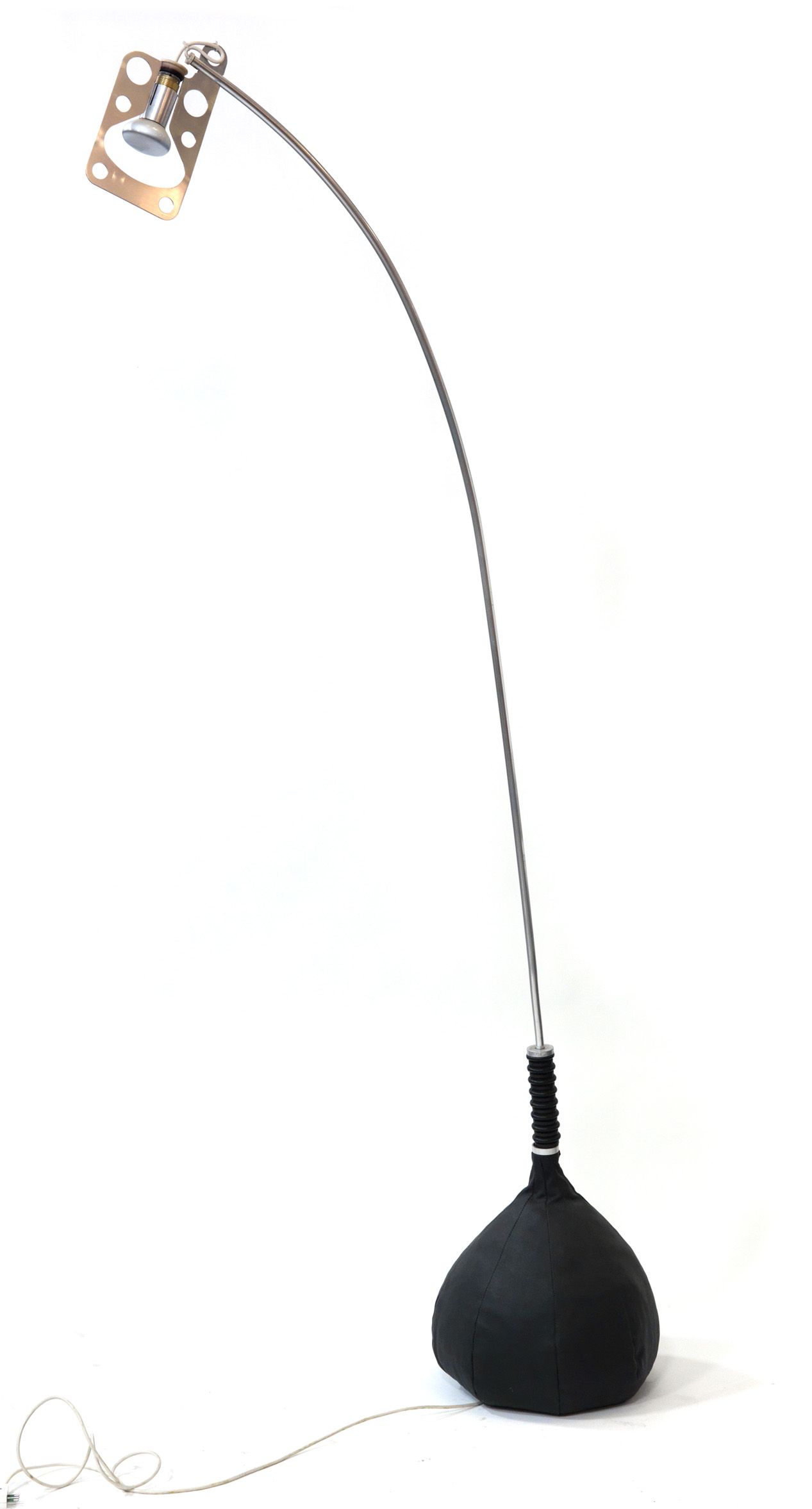 GABETTI R., ISOLA A., RE L., DROCCO, G. Bul-Bo Lampada con base a bulbo rivestita in cuoio nero, quale contrappeso e supporto di uno stelo in alluminio: sull’ asse della lampada “paralume” in lastra metallica traforata. Assetto della lampada variabile in funzione della sfericità della base. Impugnatura formata da soffietto ammortizzatore in gomma nera. Piccola serie eseguita da G.B., Milano per ARBO Torino. Brevettata. h massima cm 230 Bibl.: Esposizioni: Eurodomus 4 Torino 1972. F.Ferrari,( a cura di) Gabetti e Isola mobili, Allemandi, 1986, pag. 70, fig. 73.