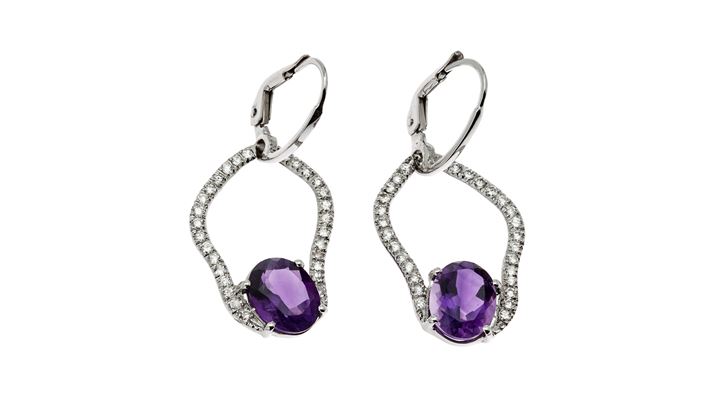 in oro bianco, a monachella, con elemento rigido fantasia in diamanti taglio brillante per totali ct 0,30 ca e due ametiste taglio ovale