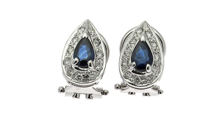in oro bianco, a lobo, a forma di goccia con due zaffiri di ct 0,70 ca, circondati da diamanti taglio brillante per complessivi ct 0,20 ca