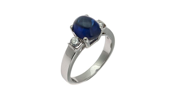 in oro bianco con al centro zaffiro cabochon di ct 2,0 ca ed ai lati due diamanti taglio brillante per totali ct 0,30 ca