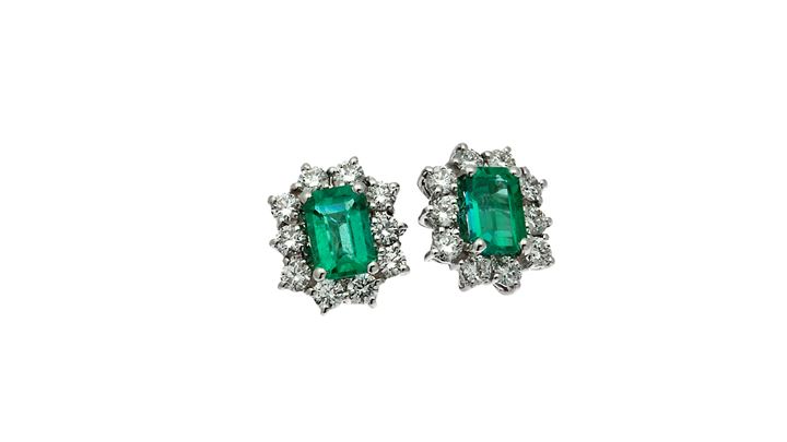 in oro bianco con due smeraldi taglio rettangolare circondati da diamanti taglio brillante per totali ct ca