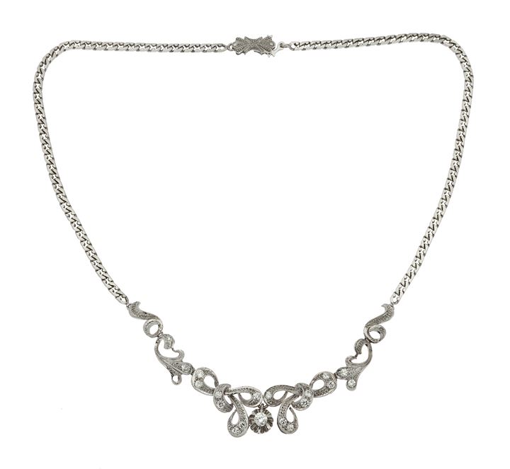 in oro bianco, catena a maglia groumette, parte centrale lavorata a volute con diamanti taglio brillante per complessivi ct 0,65 ca (uno mancante)