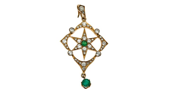 in oro giallo, di forma romboidale, con diamanti taglio brillante, di vecchio taglio e 8/8 per complessivi ct 1,50 ca e due smeraldi taglio rotondo per totali ct 0,30 ca