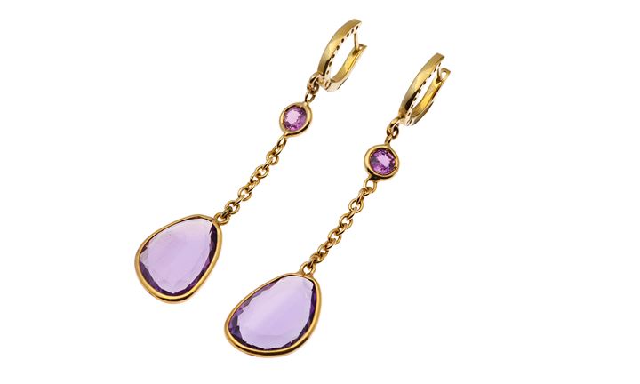 pendenti in oro giallo con tormaline rotonde, terminanti con due ametiste taglio fantasia