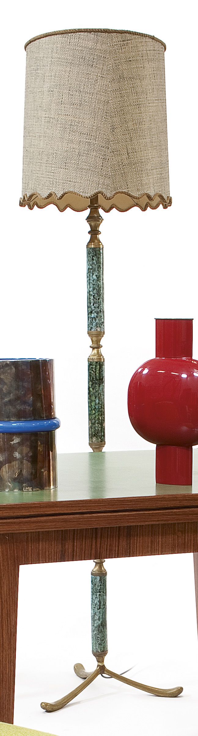LAMPADA Lampada da terra con stelo composto da quattro elementi in ceramica marmorizzata. Base tripode ed elementi di giunzione in fusione di ottone. Paralume in stoffa. 1955 circa h cm 186