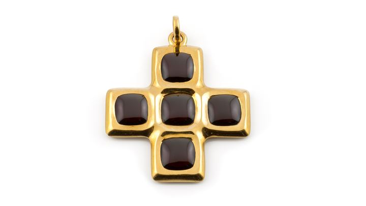 Ciondolo in oro giallo a forma di croce, firmato "Pomellato", con granati cabochon