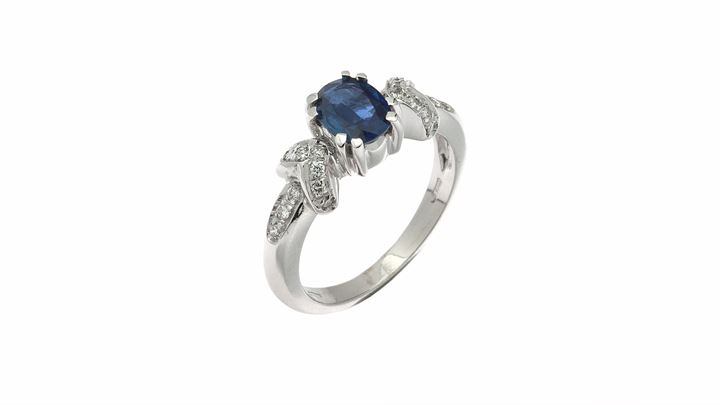 in oro bianco con zaffiro centrale di ct 1,0 ca e diamantini taglio brillante per totali ct 0,15 ca