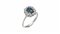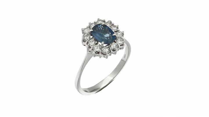 in oro bianco, sommità a margherita, con zaffiro Cylon taglio ovale di ct 0,80 ca, circondato da dodici diamanti taglio brillante per totali ct 0,50 ca (uno scheggiato)