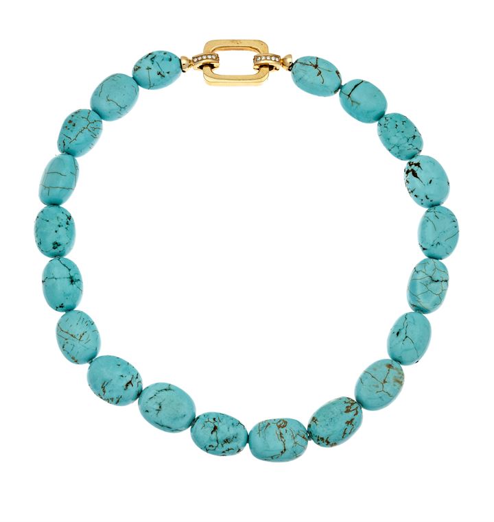GIROCOLLO con ovali in turchesi. Chiusura in oro giallo di forma geometrica...