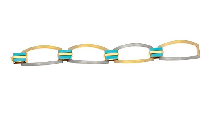in oro giallo e bianco satinato composto da elementi geometrici intervallati da inserti in turchese