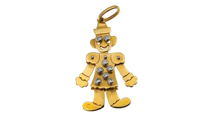 Ciondolo in oro giallo, firmato "Pomellato", raffigurante un pagliaccio con testa ed arti mobili; decori in diamanti taglio brillante per complessivi ct 0,15 ca