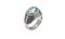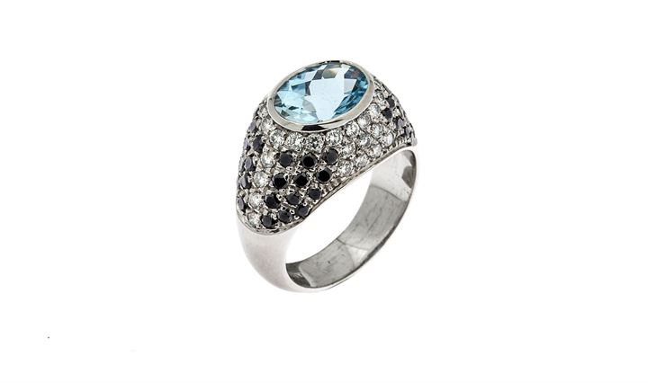 in oro bianco, sommità bombata, con al centro acquamarina taglio ovale briolette di ct 3,0 ca e pavè di diamanti taglio brillante di colore bianco per totali ct 0,90 ca e neri per totali ct 1,50 ca
