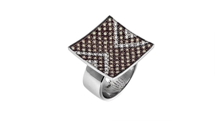 in oro bianco, sommità di forma quadrata, con pavè di diamanti taglio brillante di colore brown per totali ct 1,50 ca ed inserti geometrici in diamanti taglio brillante di colore bianco per totali ct 0,45 ca
