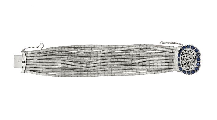 in oro bianco composto da sedici fili a segmenti satinati. Chiusura di forma ovale con zaffiri taglio rotondo per complessivi ct 4,0 ca e piccoli diamanti taglio 8/8 per complessivi ct 0,15 (uno mancante)