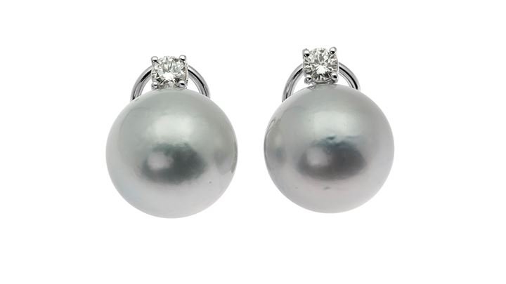 in oro bianco, a lobo, con due perle australiane del diam di mm 13,7 e 13,5, sormontate da due diamanti taglio brillante per totali ct 0,34 ca