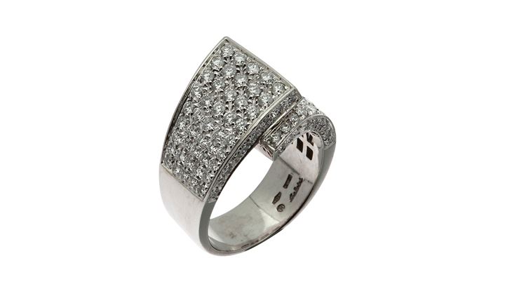 Anello in oro bianco, firmato "Salvini", con sommità ad intreccio con pavè di diamanti per totali ct 2,20 ca