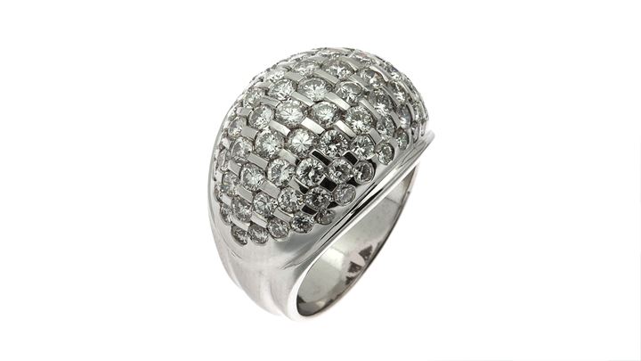 in oro bianco, sommità bombata, con diamanti taglio brillante per totali ct 3,30 ca, probabile colore G, purezza VS