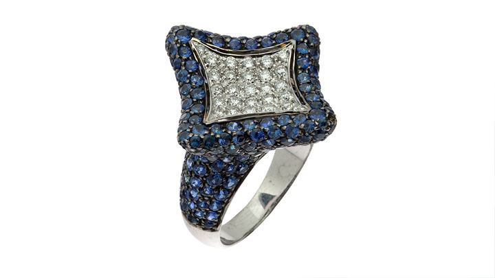 in oro bianco e brunito, sommità di forma geometrica, con parte centrale in diamanti taglio brillante per totali ct 0,70 ca e contorno in zaffiri taglio brillante per totali ct 6,50 ca