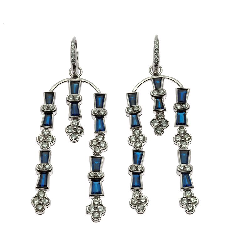 in oro bianco con sei file pendenti con zaffiri taglio trapezoidale per totali ct 7,0 ca e diamanti taglio brillante per totali ct 1,50 ca