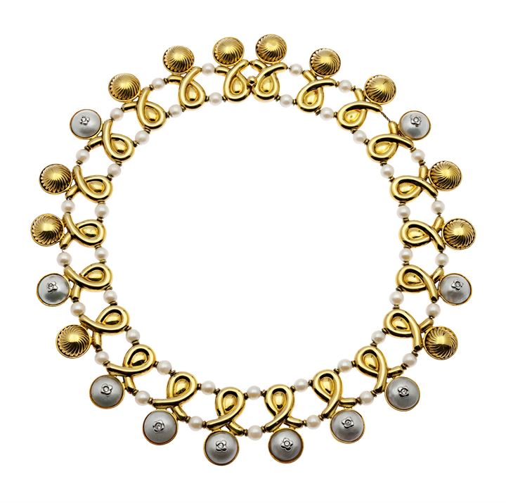 Imponente girocollo, firmato "Chantecler", in oro giallo composto da volute intercalate da perline, terminanti con dodici semisfere lavorate, alternate a dieci perle mabé con al centro diamanti taglio brillante per complessivi ct 0,30 ca.